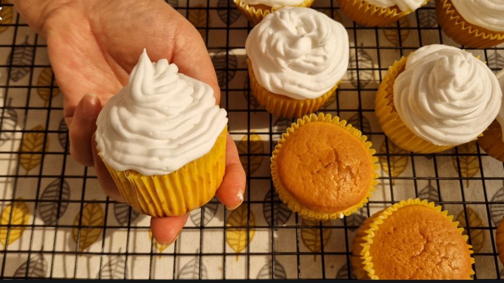 用超市里买来的Whipped cream一包(约 70 克),加入150毫升冷藏牛奶150毫升,打发到不流动状,用锯齿裱花嘴挤在自然冷却后的纸杯蛋糕表面,撒上任何一种小盆友喜欢的糖珠就大功告成了