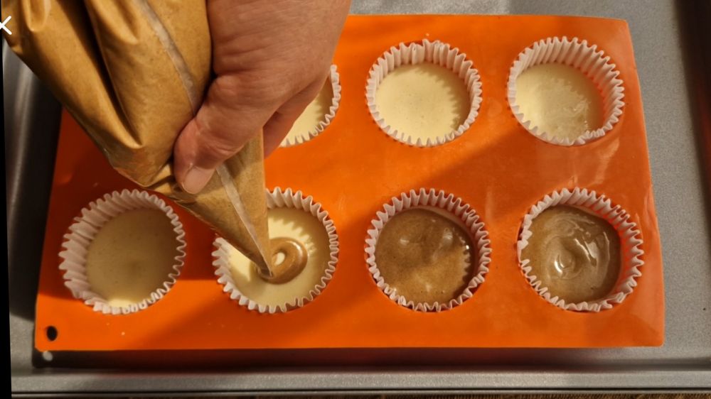 先用椰奶蛋糊填充模具,再用咖啡蛋糊填充到八分满,轻微晃动让表面平整,放入预热烤箱120摄氏度先烤30分钟,再转到140摄氏度烤15分钟
