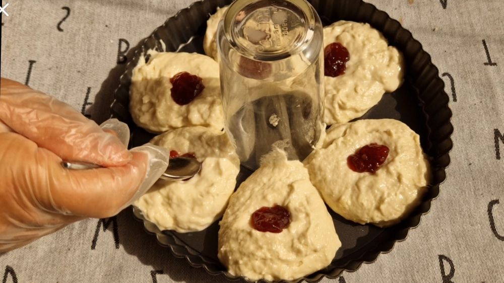 一、以上所列原料搅拌成稠面糊,用勺子蘸清水防粘分成六份铺在圆形烤盘中,中间放一个耐热杯子或者耐热小碗,每一个面糊中间放一点果酱