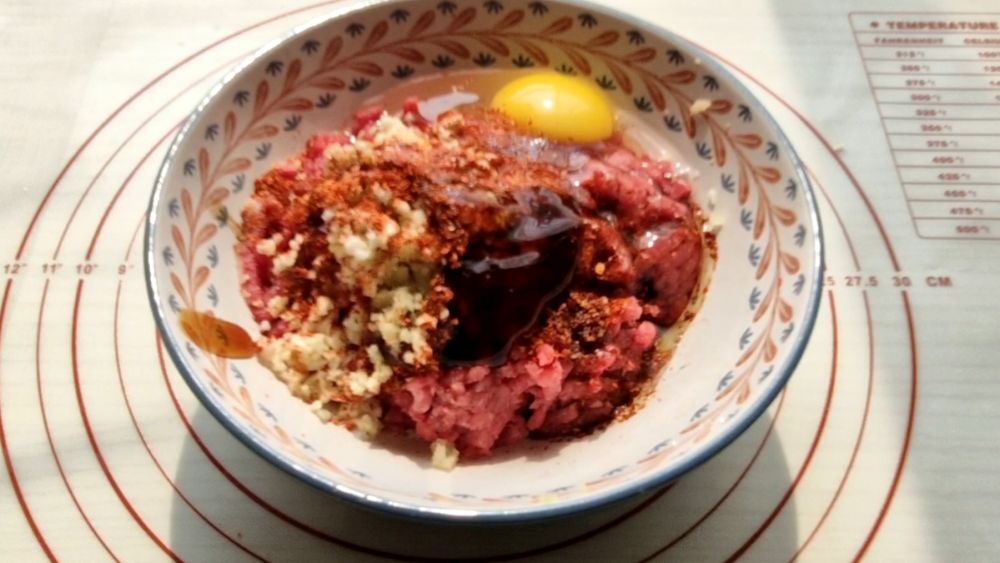 猪肉馅300克,五香粉3克,花椒粉3克,白胡椒粉3克,孜然粉6克,生姜碎20克,大蒜碎20克,食盐4~5克,鸡精3克,老抽5克,蚝油5克,鸡蛋1个,清水90克