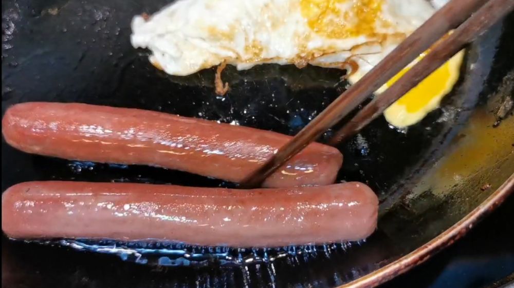 三、将饧发好的面团分成小面剂,做成圆形铺肉馅,烙至饼子变色熟透,煎鸡蛋和火腿肠,准备绿色蔬菜