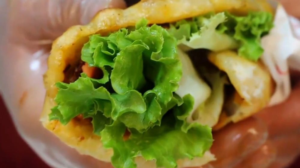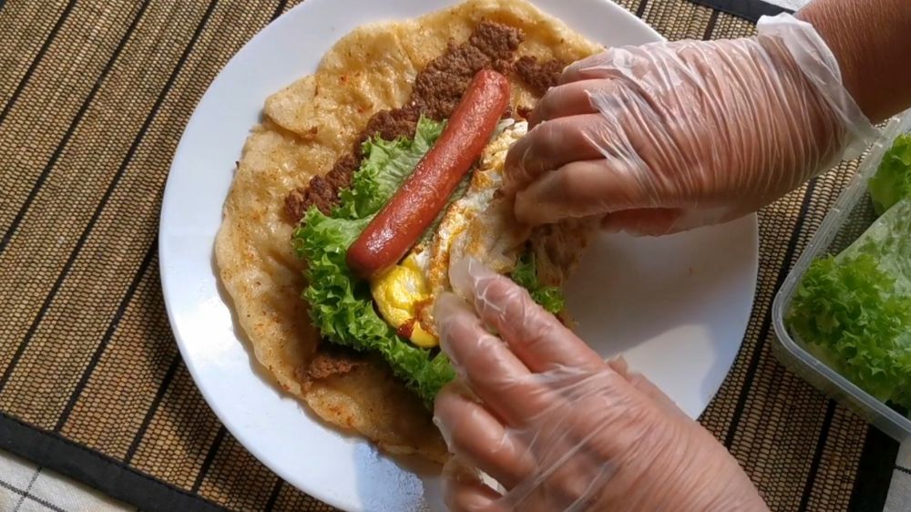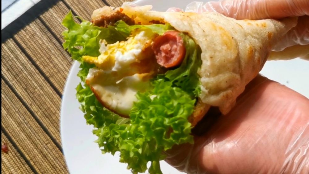 四、趁热用刚出锅的土渣烧饼卷上翠绿的生菜叶、煎熟的鸡蛋和火腿肠,咬一口柔软筋道肉馅飘香,有菜有肉又有蛋,好吃没商量!