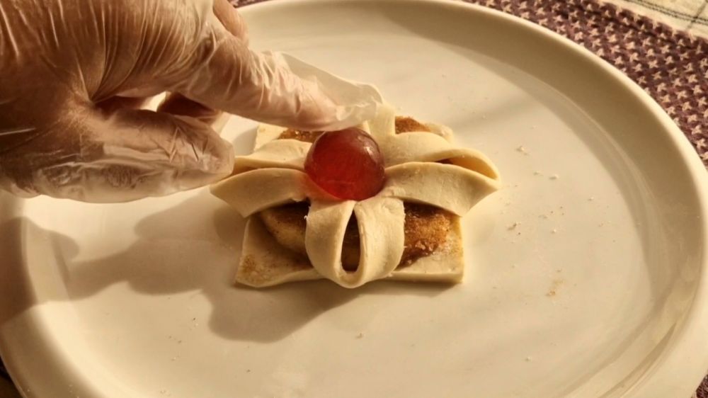 将酥皮四周如同视频中那样用刀划一下,涂一点果酱,然后四角提起把苹果片包裹起来,中间放一粒水果,搞定!(记得开始做之前先打开烤箱180摄氏度提前预热哦~)