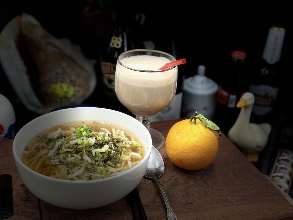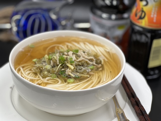 上海饮食店里的雪菜肉丝通常是最便宜的浇头面。早年我在衙门当差,晚上十一点过后的夜宵雪菜肉丝面算是老面孔, 当然, 冬笋是没有的。浇头面讲究的是汤头,我喜欢直接用日式酱油“昆布”代替。另外,煮面的时候千万别盖锅盖,这样才能保持面的弹性。