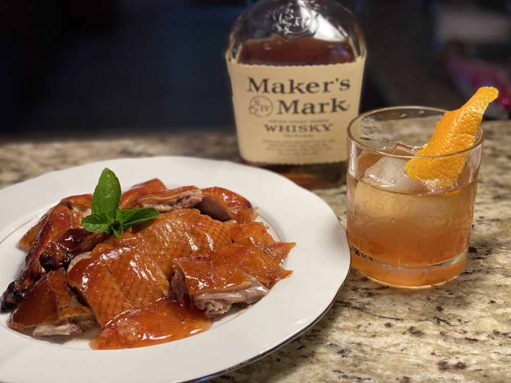 华人超市买的现成的烤鸭,回家自己切块装盘,沾苏梅酱,配威士忌。