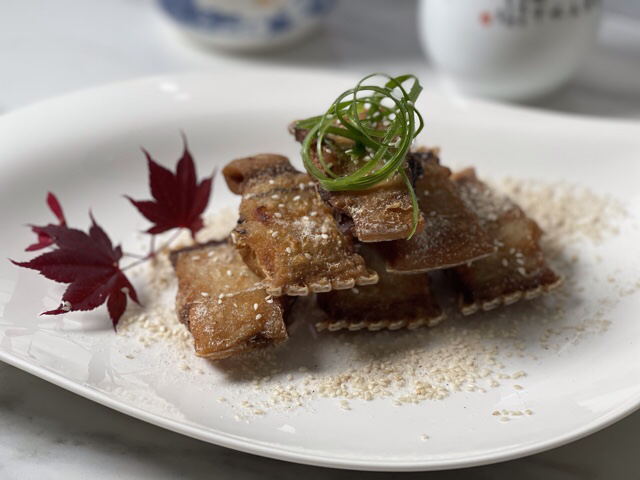 制做生煎肉皮冻时,把肥膘切下熬一点新鲜猪油渣。用金华火腿煮个高汤,加盐、糖、姜丝,料酒,猪油渣拌匀。一把阔叶韭黄,宽油旺火,快速翻炒,油渣调料跟着下,翻匀出锅装盘。