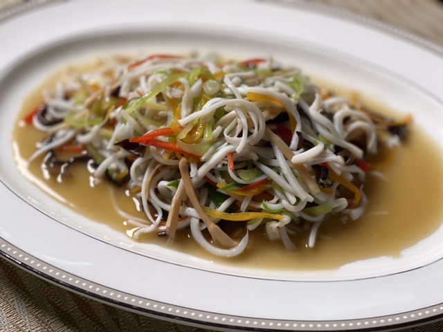 墨鱼丝、木耳、黄花菜、红椒、莴笋丝,好看又好吃。