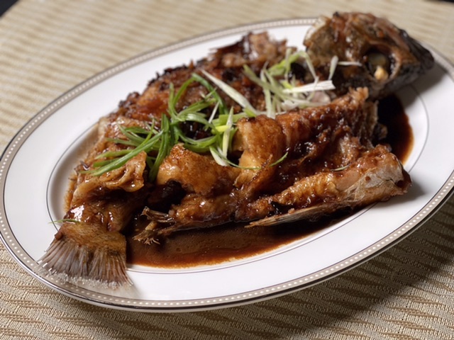 活的黑石斑鱼,放了点黄豆酱,蒜瓣。