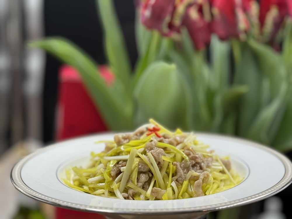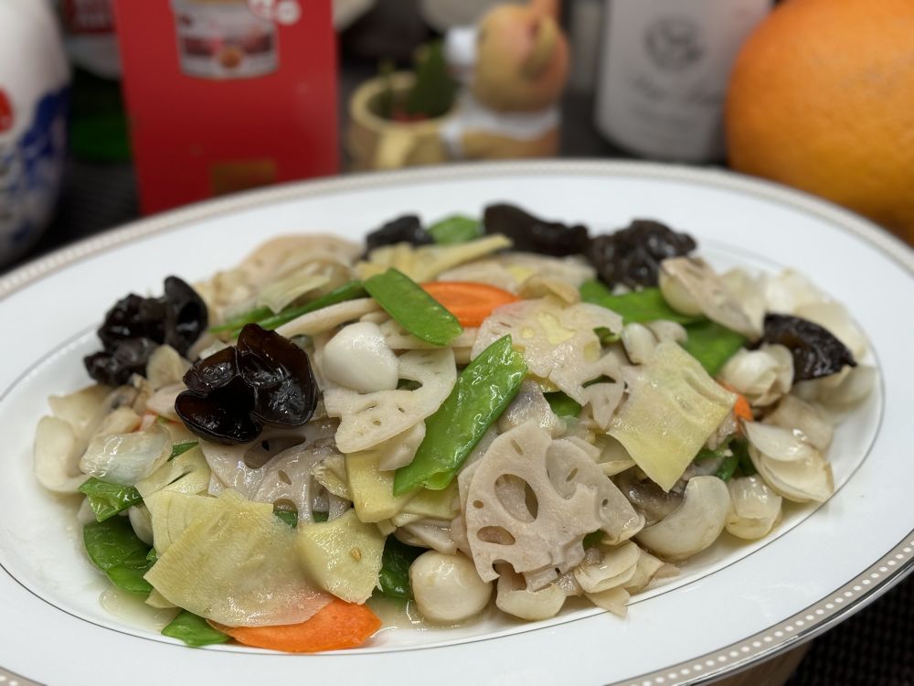 鲜百合、蘑菇、藕片、荷兰豆、黑木耳、冬笋、胡萝卜一起炒。