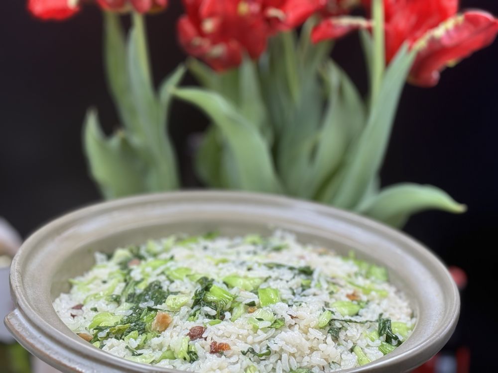一小块咸肉、二条广式香肠,三两爆捏上海青,猪油一拌,四碗不过岗。