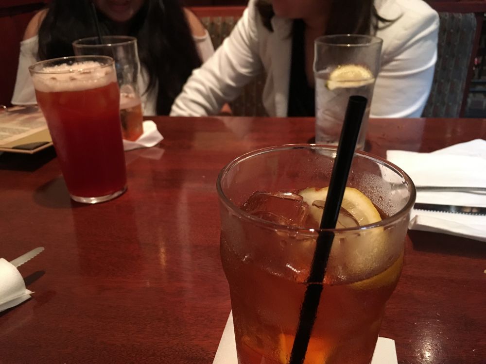 领导喝冰水,娃喝草莓茶,我喝柠檬茶。露肩装是娃,领导穿白西服,我在相机后面。