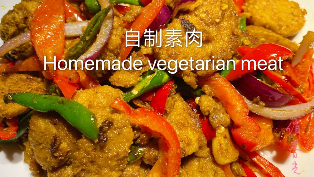 这个素肉是我几年前自己瞎琢磨的,因为很喜欢国内的那些花样豆制品,我们这里是买不到的,就试着用各种食材配了面筋粉来做点,虽然和国内的不一样,但是也获得了一种新鲜口感的食物,很满意!