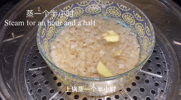 猪皮丁放入玻璃容器,加水蒸1个半小时