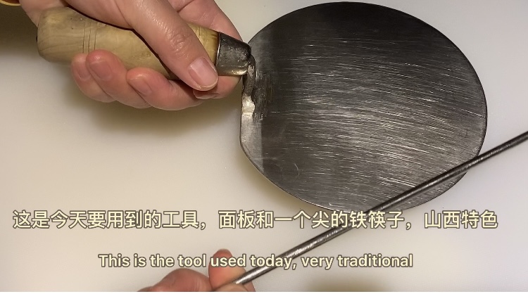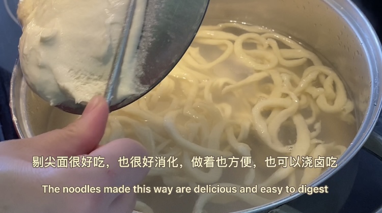 水开后,剔面了,这是一个熟能生巧的过程,越做越有经验,用铁筷子沾水随时整理面团,推出薄薄的一层面,这样更容易剔面。当面团很柔顺的拉长入锅时,心情也舒畅的。
