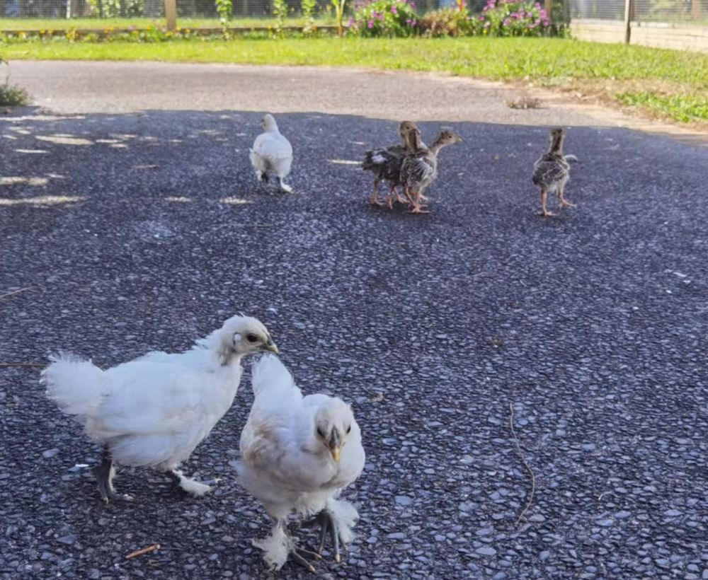 一周前, 小凤冠们 在阳光下自由的奔跑, 与小查理们抢吃的, 我们到的时候, 还有五只查理, 其中一只 弱弱的 跟不上群, 缺失的一只, 是 小凤冠的代母 那只不太洁白的凤冠,看着 查理不顺眼, 把他给叨S了~~