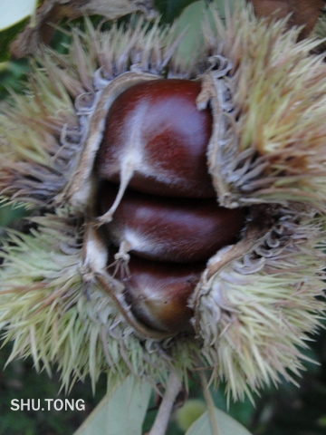 每个栗蓬里有3枚新鲜的板栗, 这是正宗的中国板栗。