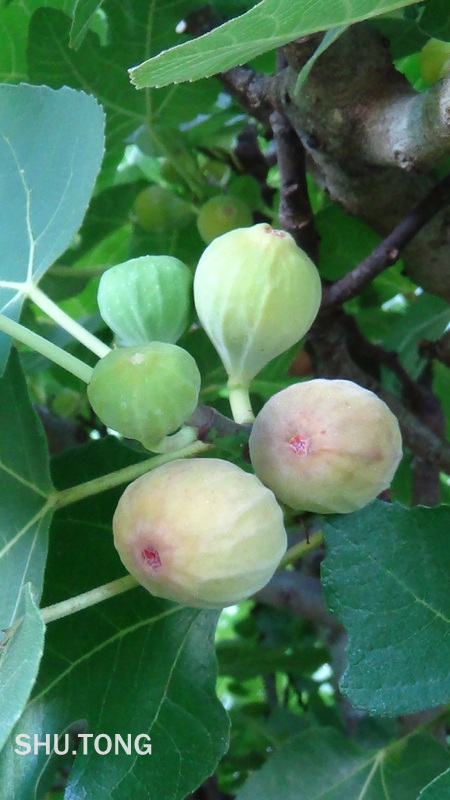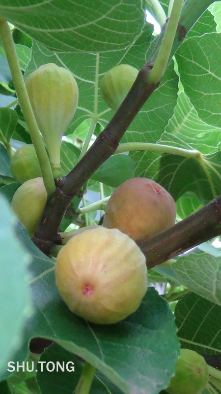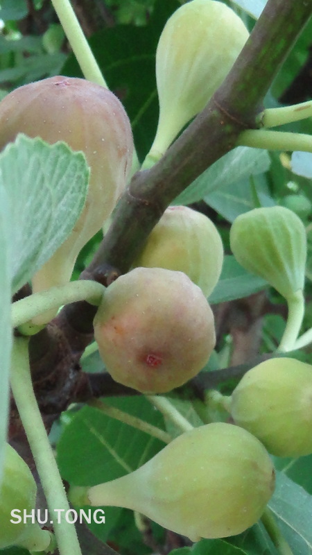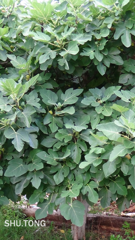今年夏天热,雨水不多。园里的无花果树上的果实不像往年