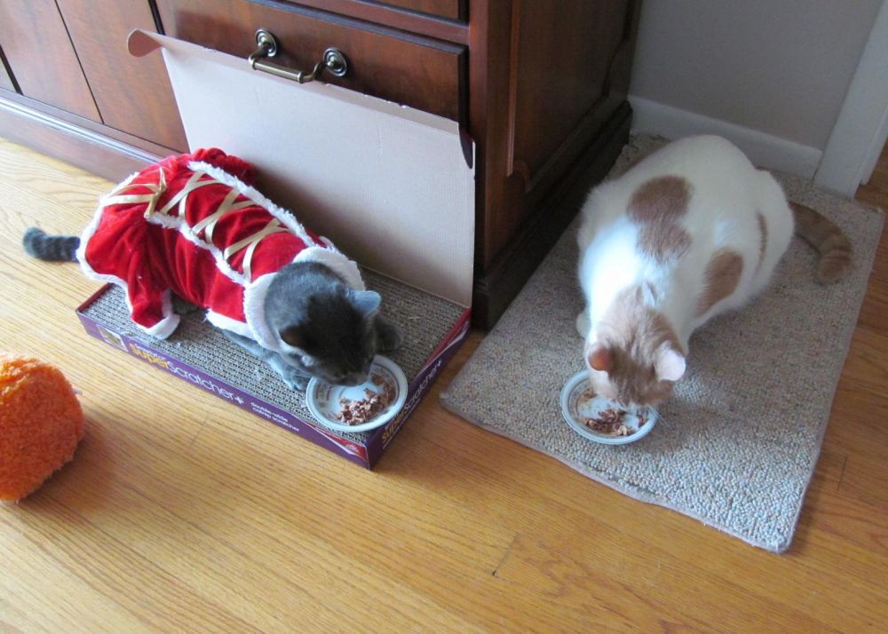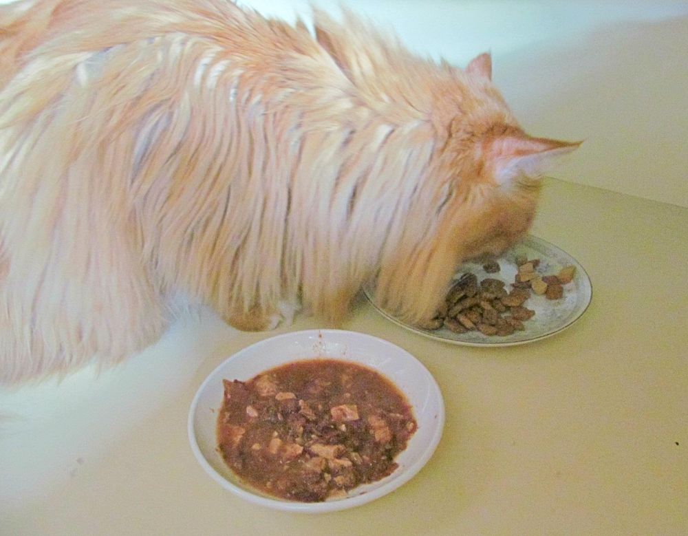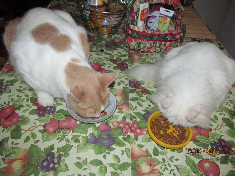 麻麻劝解抑制着小灰欺负少爷哥哥, 少爷现在的情绪心情不错.加上天气马上要不热了, 少爷的胃口开了很多,现在的体重有回升的趋势. 很难得, 少爷跳上饭桌和小美妹妹一起吃饭.