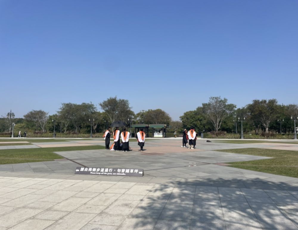 远处有几位大学生在拍毕业照