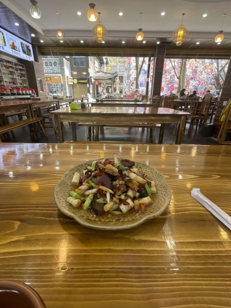 然后点了我的最爱:腊肉炒笋干 52元,一桶饭3元,茶免费。我狂风扫落叶,一点不剩