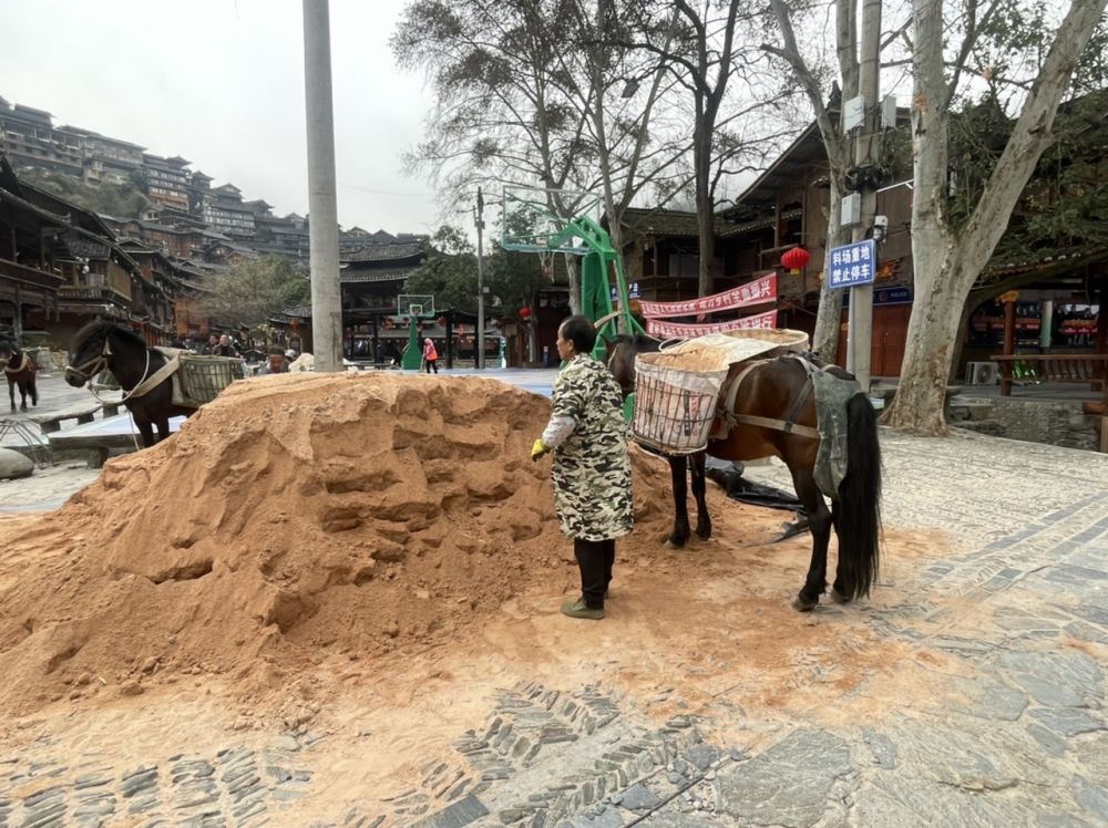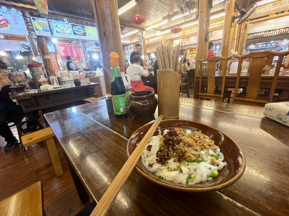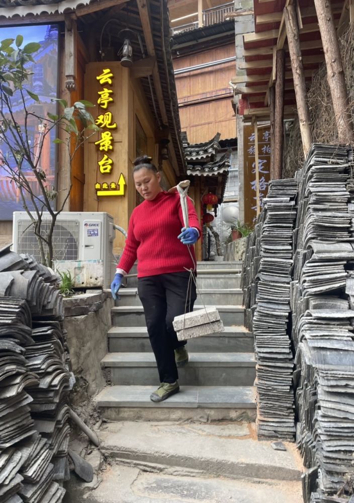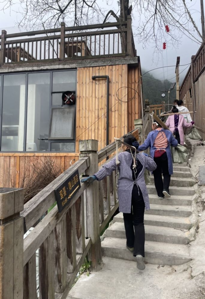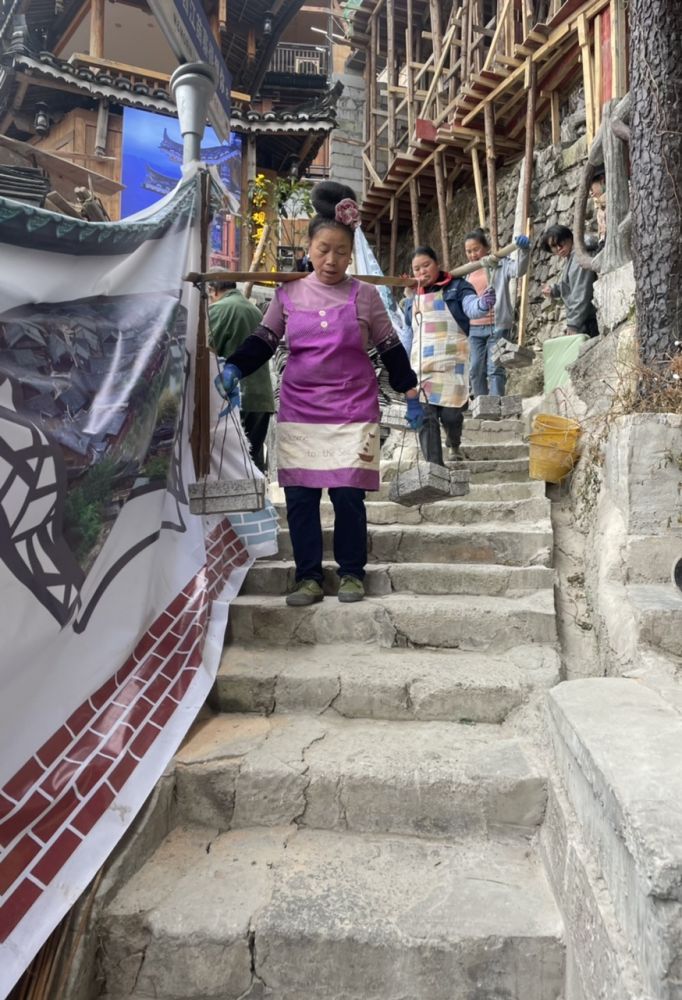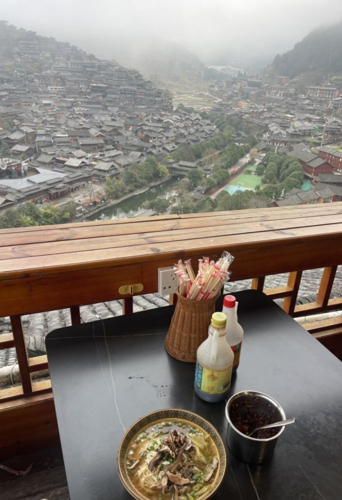 晚上在一家饭店吃了一碗汤粉,15元。没有传说中的那么离谱。去前看到好些人吐槽说苗寨非常商业化,我不清楚商业化的具体含义是什么。我倒是没有任何消极的感觉,因此比想象和预期更加好:-)极力推荐! 以下有几张搬运建材上下阶梯的照片,使人了解在此地建房满足游客需求的艰难,加上修路等等,收门票也是合情合理的。另外我没有见到任何给游客施加压力购物吃饭的情况,反而觉得出奇的文明斯文。