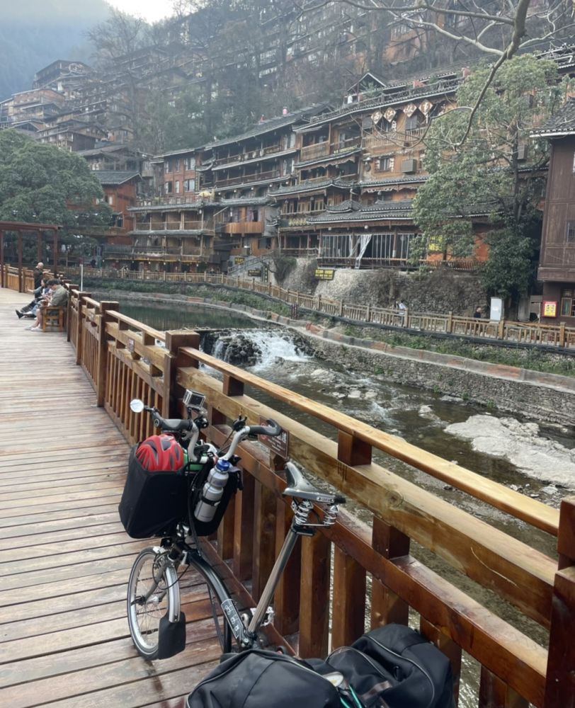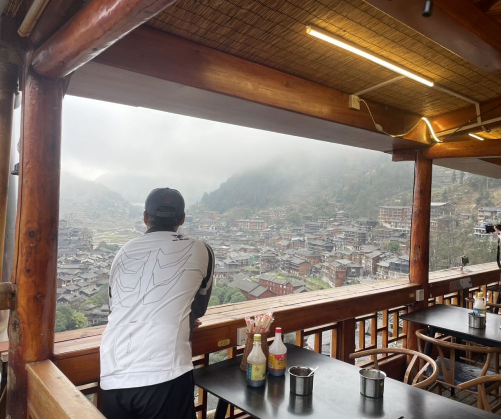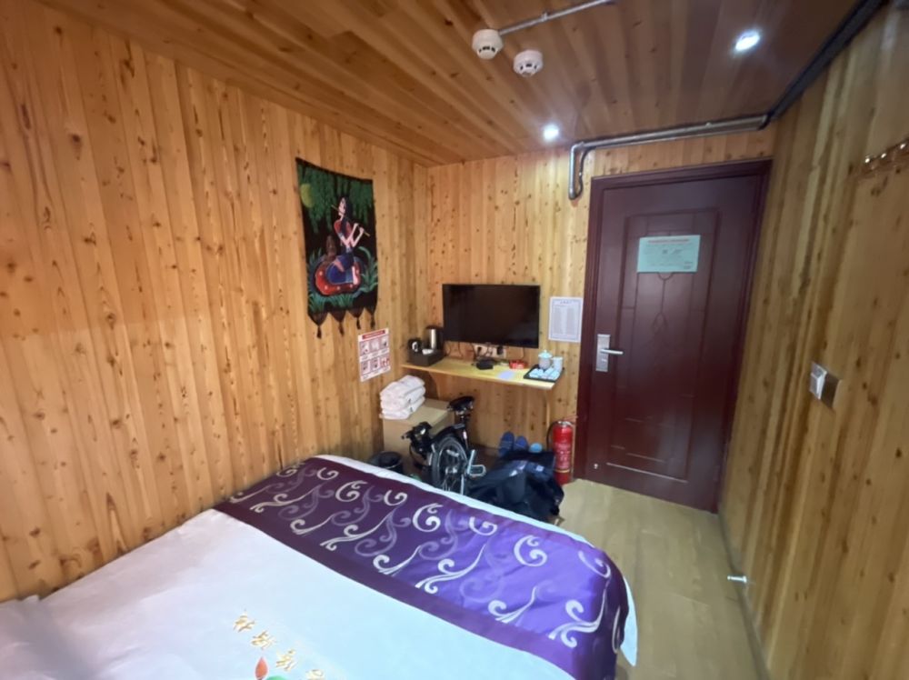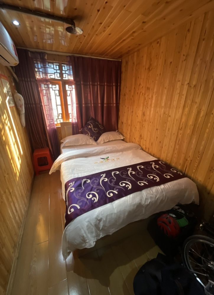 我推着自行车在街上转了一圈,地面上基本都是商店,没有看到民宿的招牌。正当我在一家小超市外慢慢走过的时候,里面走出一位苗族大妈,轻声地问:你要找住宿?我说:是的。她说:楼上有。我说:我可以看看吗?她说:行。 于是她帮忙提着我的行李上了二楼。上得楼上一看,比楼下显得宽敞多了,真是内有乾坤。 她先让我看250元一晚的,接着看了看200元一晚的。然后我问有没有更经济一些的,于是她让我看了一间不带卫厕的单人房,卫生间就在对面,考虑到当下不是旅游旺季,而且苗寨的游人不多,旅店里也是安静冷清,而且我打算最多只住两晚,这间120元一晚的正合适。于是我说:就这间。