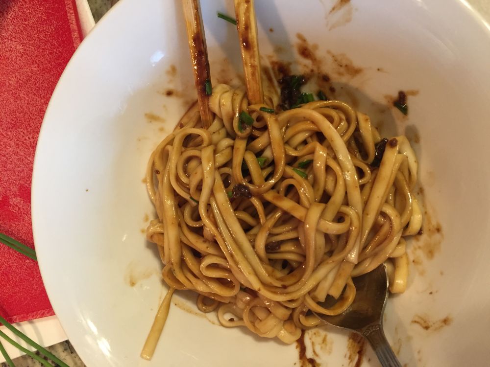 女儿总是对美食有特殊的嗅觉,买了一大包便宜的泡面不吃,拉出来我两个月前去买的袋装拌面,我看着眼馋也拌了一碗,只能吃半包,酱料很不错,不过不能全用了,地道.