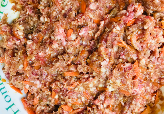 一个洋葱切小粒,用油炒到焦糖化。一个胡萝卜切细丝,用少量油炒熟。两样冷却以后和一磅羊肉混合。然后进行调味。