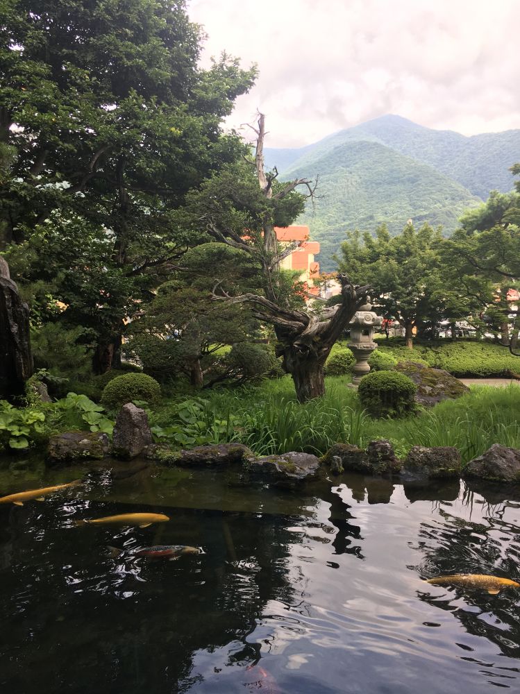 从玻璃窗可以看到外面的小花园和水池,池里还有大鲤鱼