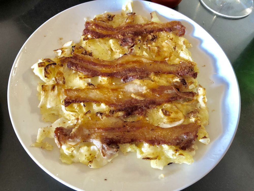 做法很简单:圆白菜切碎,用面和鸡蛋和在一起,如果有粘粘的山芋酱就更好。薄一点的肉片比较好。把钢锅涂一层油,粘粘的料放进去,考1-2分钟,把肉片放在上面。翻个,肉片的一面变成最下面。考到2-3分钟,肉和饼都熟了就出锅
