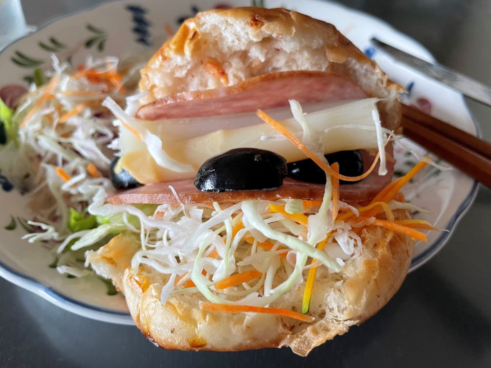 面包吃完了,还可以用ham加沙拉吃,少了樱花虾的味道和糊糊的面包的脆香,不过橄榄的味道更足了