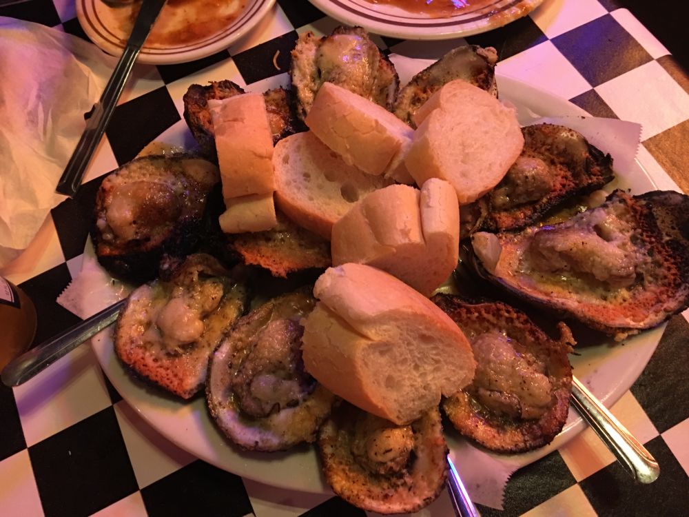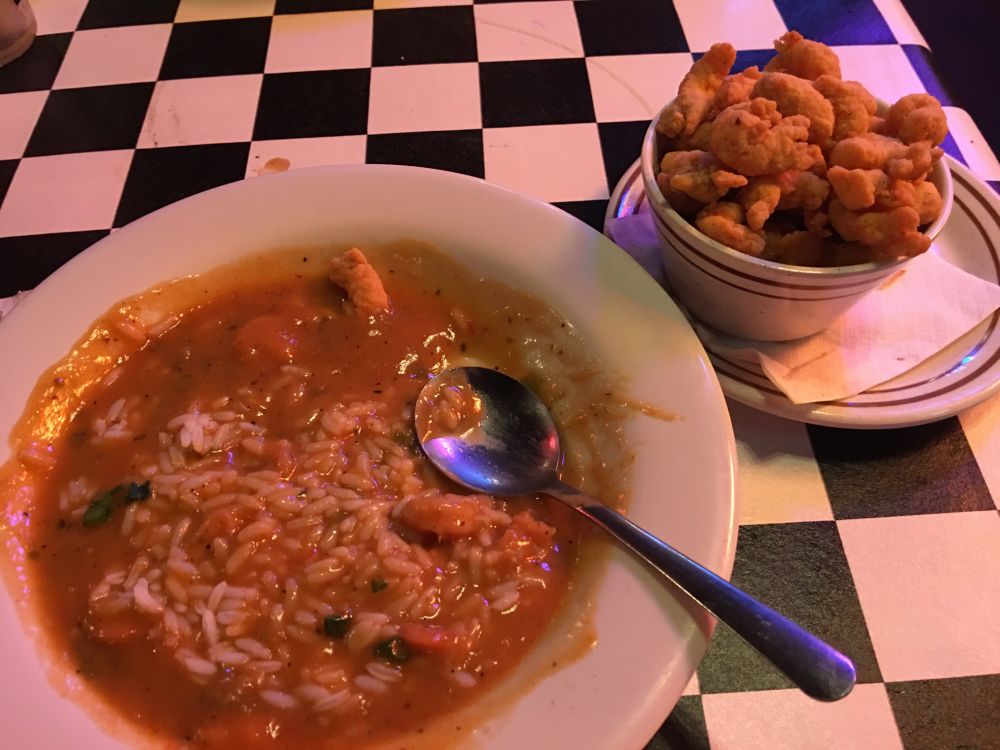 晚上在 Acme Oyster House 吃饭。排队等候用餐的人排了半个街区。海鲜什锦饭 jambalaya 和海鲜浓米汤 gumbo 加上碳烤牡蛎。