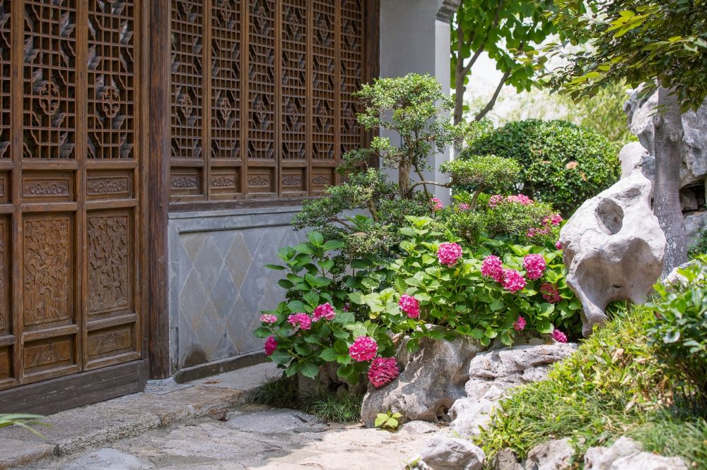 青瓦白墙,绿树古亭,水中锦锂,盛开的石榴花,绣球花,一切是那么让人赏心悦目。