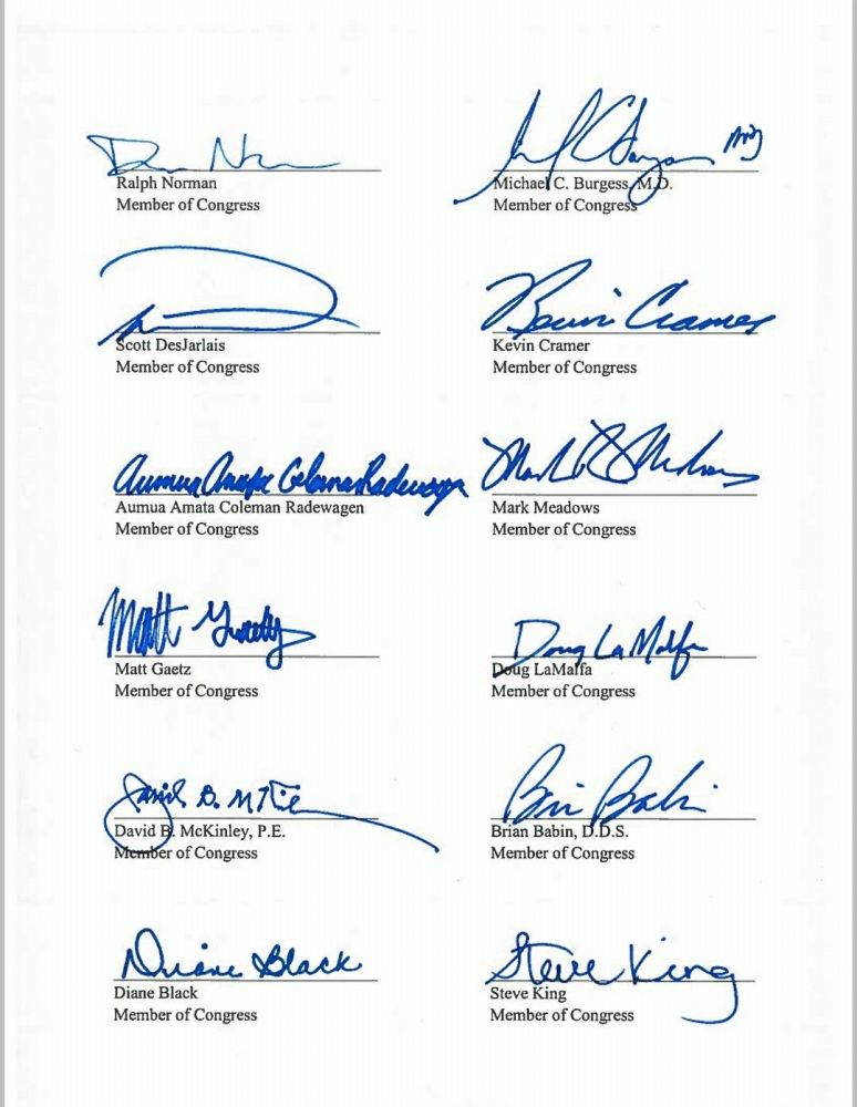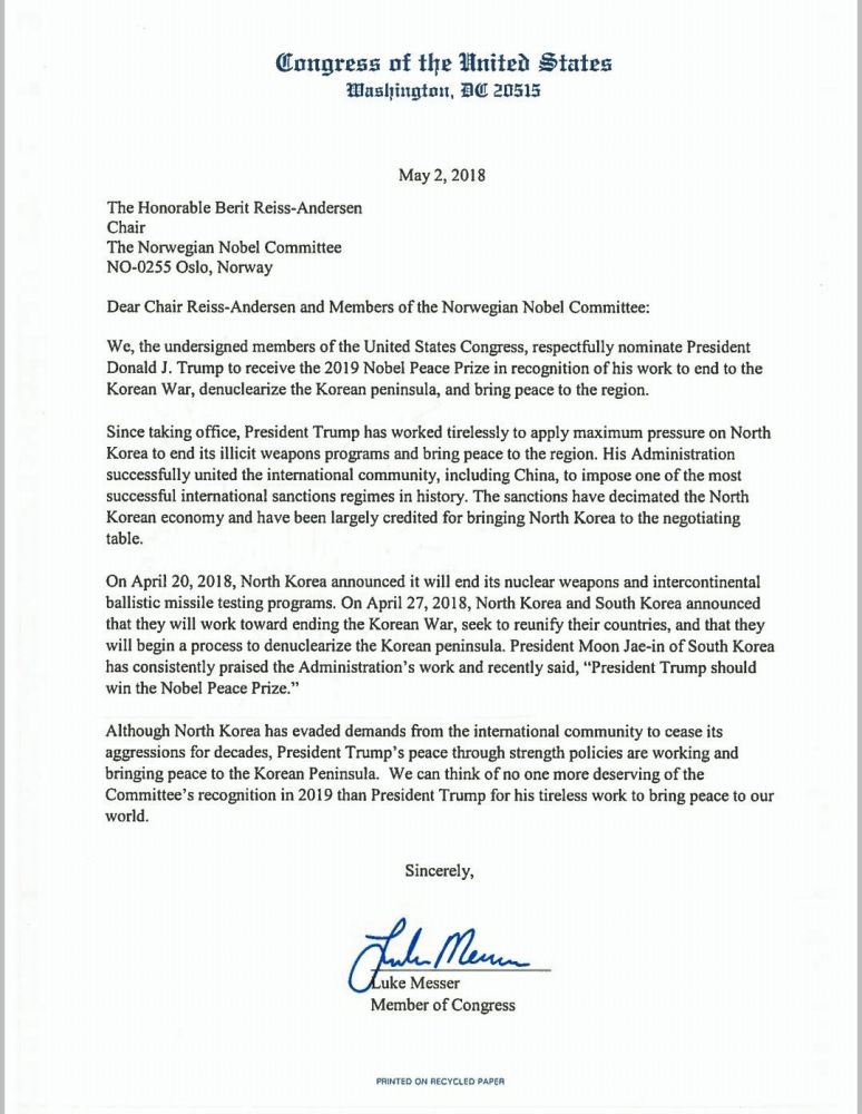 共和党议员提议川普为诺贝尔和平奖候选人的信和签名