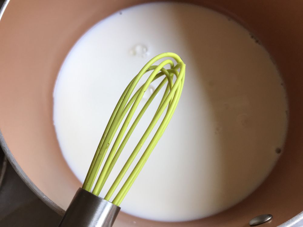 2.两杯全脂牛奶用中火烧开把焦糖布丁混合材料倒入搅拌匀,在滚上几分钟。取下来倒在小容器中就成了,放凉以后自动脱模。