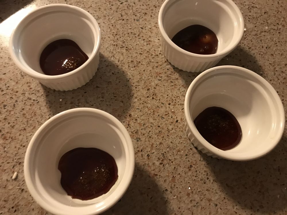 1. 四分之一勺白糖放在一个小锅中用中火融化成焦糖,这一步要小心,不要烧焦了,把融化的焦糖立即分倒在小容器里,一包混合原料可以做四个,所以要分在四个小容器里。