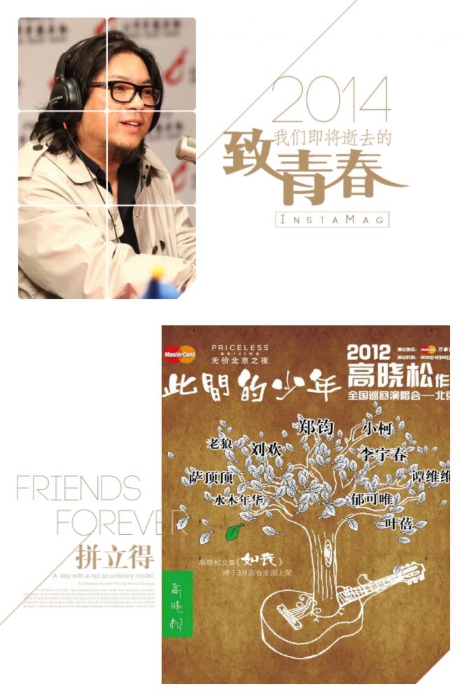 《”此间的少年“2012高晓松作品全国巡回演唱会》是至今为止最新最全的一次他的作品展示,请到现场演唱的个个都是当今歌坛的风云歌手:刘欢、郑钧、小柯、老狼、水木年华都和高晓松算是校园里的师兄师弟,李宇春、谭维维和郁可唯三位超女都经晓松提携起步,叶蓓、萨顶顶也是因演唱晓松作品而成名的。