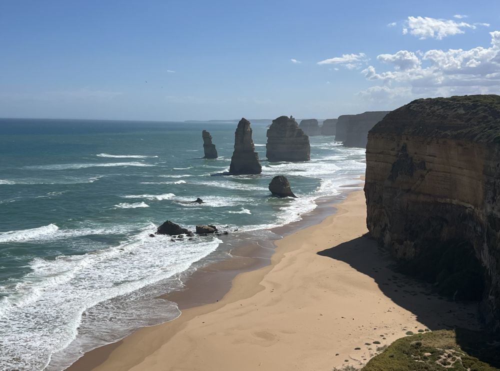 Great Ocean Road 是澳洲东南沿海的最美风景线,是一战的退伍老兵用原始的工具手拉肩挑花了12年修成的286公里的路。一路上海洋,沙滩,悬崖,峡谷,瀑布,雨林,公园,营地,农场和小镇目不暇接,简直就是加州一号风景线的翻版。大洋路上最独特的景点是十二门徒 Apostles 。那是坐落于大洋岸边的12块巨大的断壁岩石,经过几百万年的风化和海水侵蚀而形成,其形态各异犹如人面。随着岁月流逝,有4个门徒已经倒塌,所以人们说这是“正在消失的美景”。来自全世界的游客愿意花12小时来回开车500公里,到此一睹门徒真容。