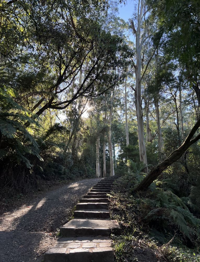 Dandenong 源自于原住民词语 Tanjenong(高山)。Dandenong Ranges公园是乌伦杰里人的文化景观之一。今天乘火车换公交车2小时到公园。攀登著名的 1000 级台阶,到山顶欣赏墨尔本和亚拉河谷的景色。走在公园内宁静的森林步道,聆听琴鸟的鸣叫,也算是一种享受。因为时代不同,没有发现原住民。地点不对,没有找到奥林达瀑布。时间不准,没有看见开了花的山梣树 - - 世界上最高的开花树。