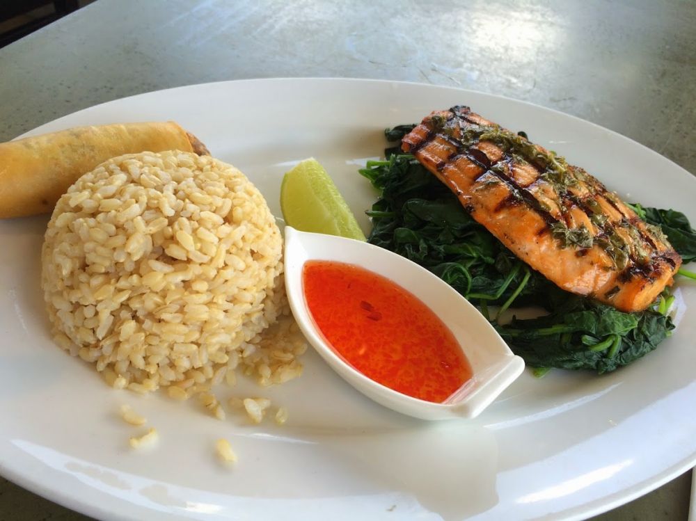 烤三文鱼,菠菜,黄糙米饭,还有一个炸春卷,喜欢那个船型的装调料的小碟
