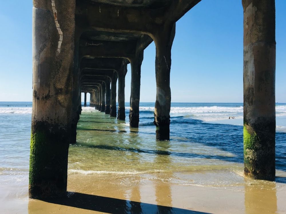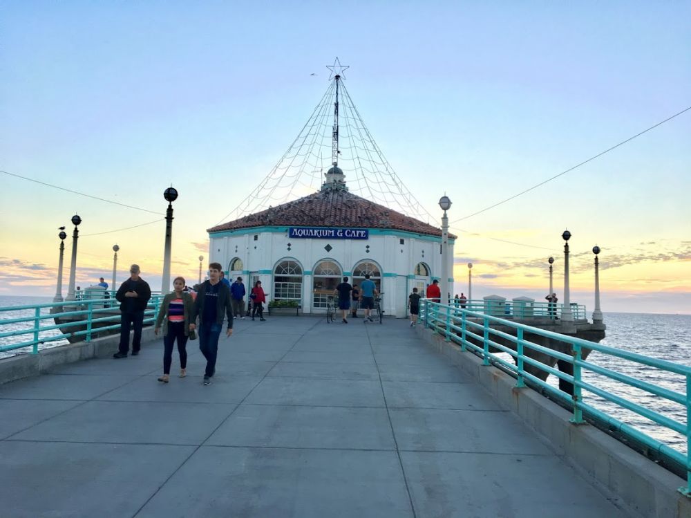 如果说Santa Monica的栈桥是木结构为主的话,那么曼哈顿海滩栈桥是现代化的钢筋混凝土建筑。粗壮的桥墩水泥柱很有阳刚之气,是女泳装模特们的最爱。栈桥的远端有著名的Roundhouse,一个多角型的建筑,在这里可以喝咖啡, 里面还有一个迷你的水族馆。