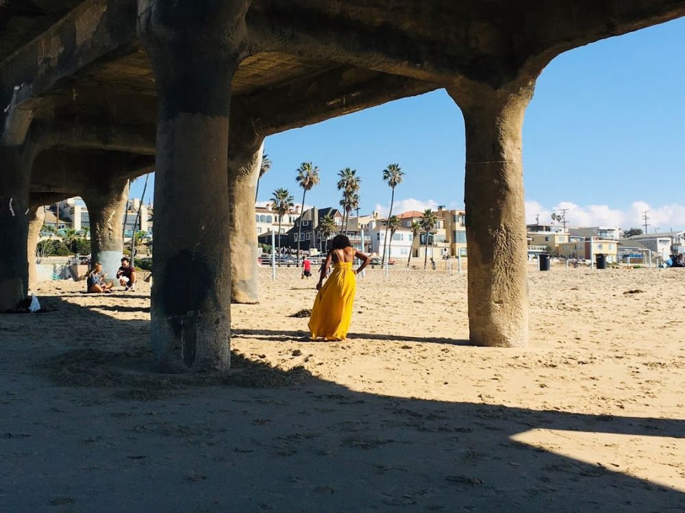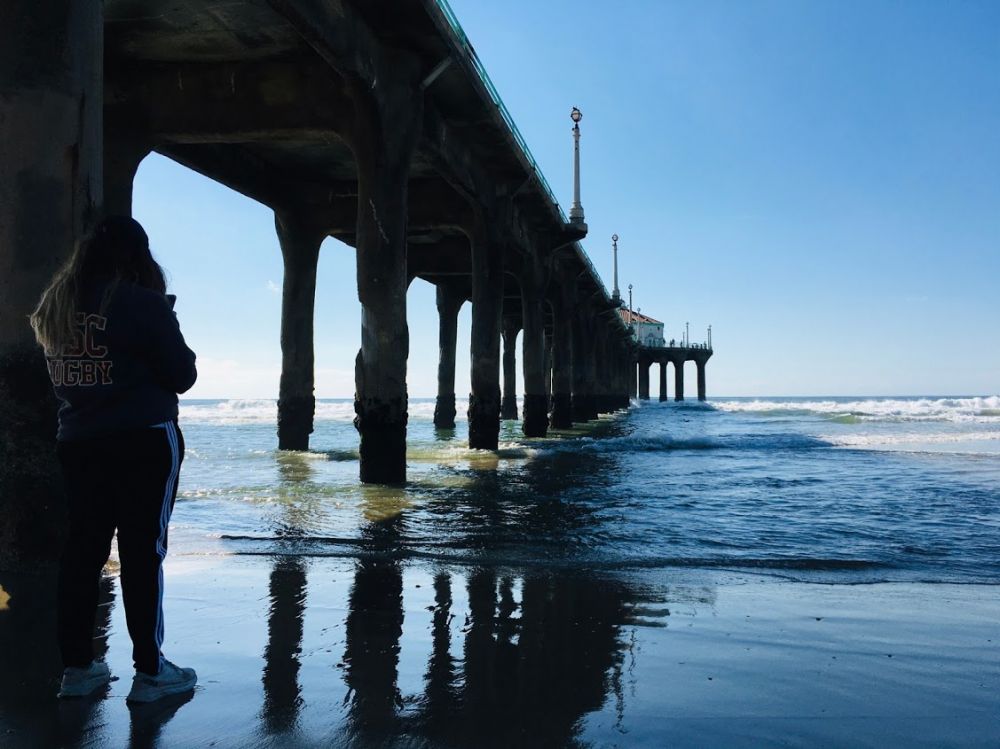 在栈桥上观看曼哈顿海滩的市容