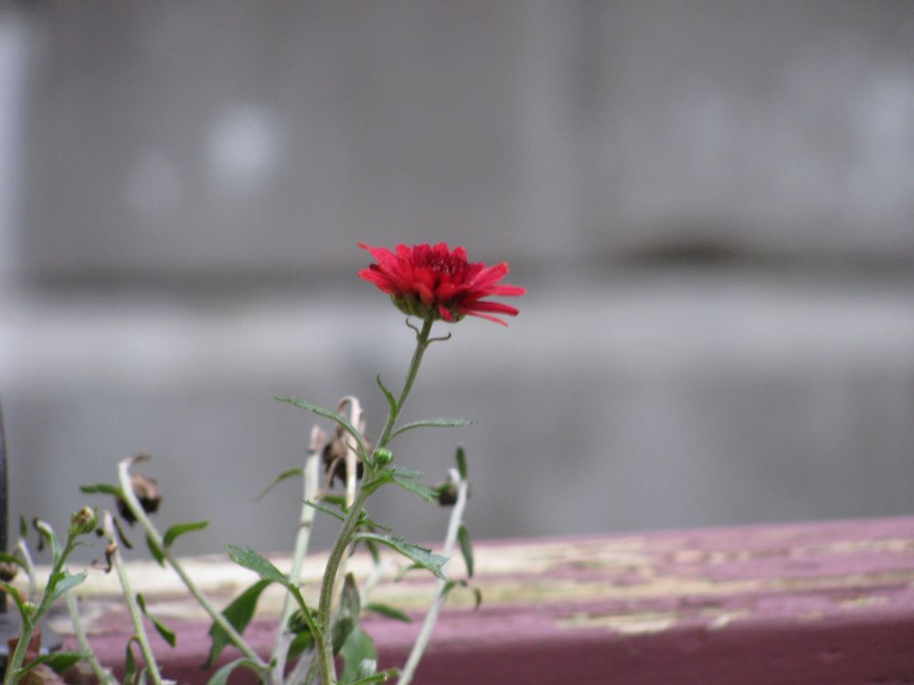 深秋了,天也凉了。园子里满地的枯叶,就像是一大张枯黄的被子盖在了草地上。园子里树叶也快掉光了,星星俩俩地挂在了树上。 那满园的花儿,也不知躲到哪去冬眠了。原本满目的绿叶,被秋风吹得只剩下了树杆。记得,秋天刚开始时,绿草上撒着几片绿叶,很有诗意,可现在,那么多的枯叶,刚扫完,一阵秋风,又是满园的枯叶,仿佛秋风就是叶的天敌。 不禁想起了夏天,园子里花儿草儿,树啊,鸟啊,很是热闹,可现在,除了每天不得不扫的落叶,没有了春的影子。而且扫落叶是一体力活啊!谁曾想到,曾经的美,变成了现在的累!累也得扫啊!要不满园被枯叶盖着,总透着那么一种凄凉!就在今天扫落叶时突然发现了深秋最后一朵皱菊,静静地,安详地注视着冬天的到来!她是那么的小巧,那么的新鲜,给人一种虽我小,可我一样旺盛的感动!特别在这秋风瑟瑟,秋雨潇潇的时候!