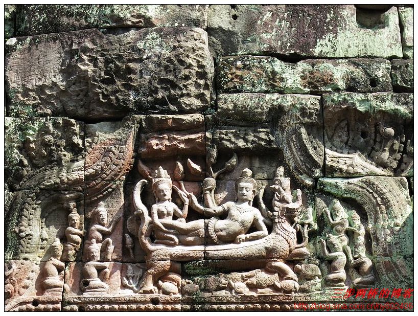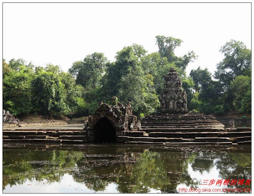 涅盘水池(Neak Pean),建于12世纪的涅盘宫是由五座水池构成,中央为一大水池,而东南西北边各连接一座小水池。据说是以前提供医疗的寺院。中央大水池种植数千种药草,四个小水池分成四行及四方(类似中医的五行理论)。先让族里的祭司判断,然后分送四方浸泡药水。在大水池的正中心点有一圆形的塔,此塔用作供奉神灵,有七层台基,最下层有两条缠绕的蛇王,当地人称这里为Neak Pean,意思是“缠绕的龙”,这就是涅盘宫名称的由来。最神奇的莫过于此地的圣水,具说它有治病的疗效,信不信由你。
