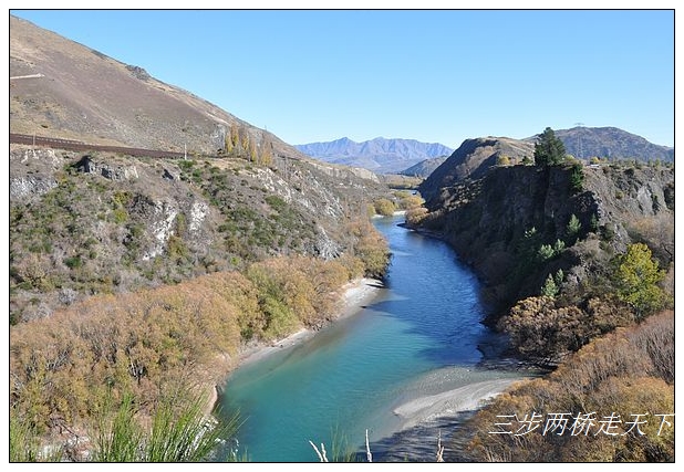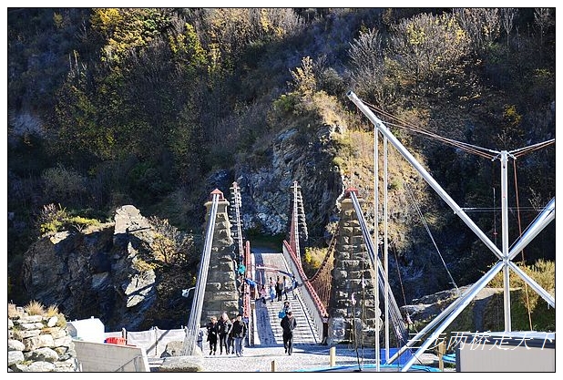 过了Lake Hayes,来到蹦极跳的发源地。高高的Kawarau山涧下,是一条深不可测的湍急河流,山涧两边的山头上横跨着一座铁桥。