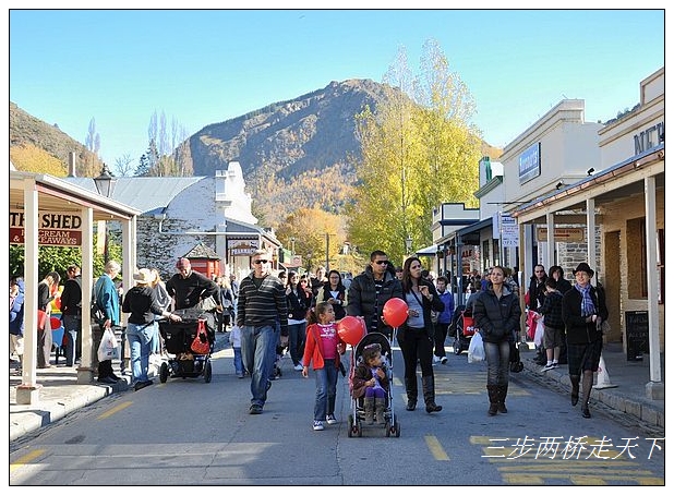 离开酒庄我们驱车前往曾经的淘金重镇—箭镇(Arrowtown)。大约150年前,这里曾经以丰富的沙金含量而发迹,吸引了络绎不绝的淘金客远道而来,逐渐发展成为一个超过七千人的完整聚落。我们来到时,这里正在举行一年一度的秋节(Autumn Festival)。 小镇上人头济济,人们携儿带女,无处不洋溢着祥和温馨的景象。