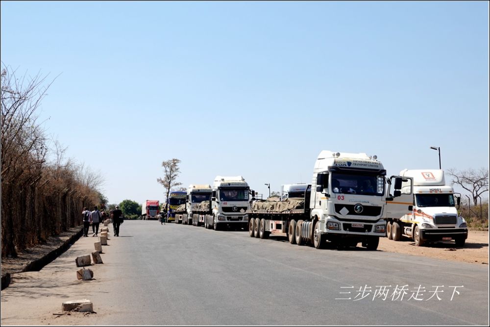 桥边过境两国的车队。