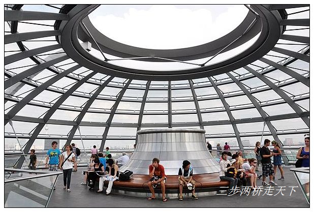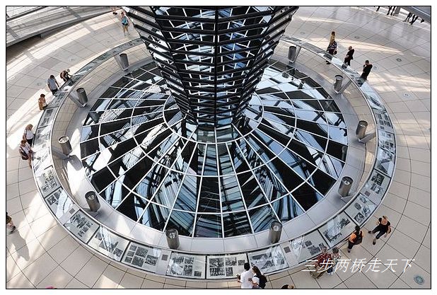 参观时讲解机里的解说词再次证实了导游的解释,多次提及议会制民主的公开性和透明性,这也是为什么国会大厦在后来重修时使用玻璃的一个重要原因:使用玻璃,是可以让每个人都能看到国会开会时的情形。沿着向上的环形通道走到接近顶部,从中间巨大的玻璃柱望下去,我们的确看到了底部的议会大厅。
