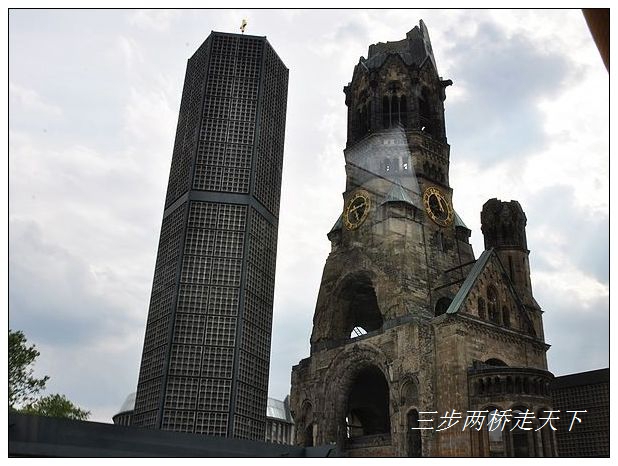 虽然柏林的建筑物大多在二战中被毁,但勤劳的德国人基本按原样恢复了,只有一处例外:市中心的威廉一世纪念堂,德国人保留了它二战后被炸毁的原貌,原来雄伟的教堂,顶部被完全炸毁,只有底座的部分还算完好,德国人保留它,是想告诉后人,战争带给人民的,永远只能是毁灭和苦难。古老的德皇威廉一世纪念堂两侧,建有八角形的新教堂和钟楼。