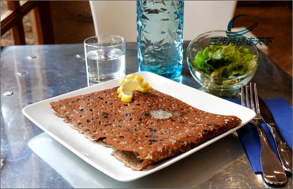午后,我在孔克小镇上吃了午餐,肉和菠菜馅的法式煎饼。
